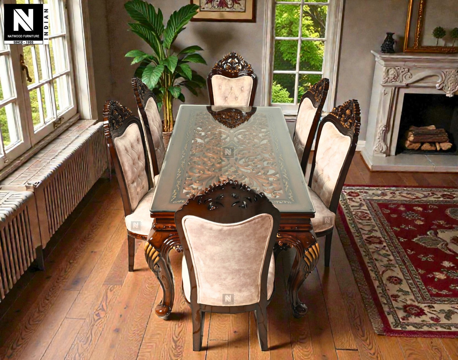 SA HEAVY CARVING 6STR DINING TABLE WITH GLASS WITH SA HEAVY CARVING GODI TOP DINING CHAIR